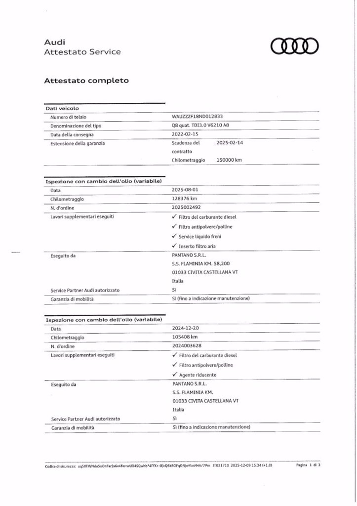 Vettura ufficiale italiana, unico proprietario, regolarmente tagliandata presso ns. reparto service Audi come da documentazione allegata, tenuta in ottime condizioni. Colore nero Mito metallizzato, trazione integrale Quattro, cambio automatico sequenziale, allestimento Sport, optionals: alloggiamento specchietti nero, Audi smartphone interface, Audi virtual cockpit plus, cerchi in lega da 22 pollici a stella, pacchetto look nero, luci diffuse a led, pinze freno rosse, proiettori anteriori matrix led, sterzo integrale, tetto apribile, vetri posteriori oscurati, volante sportivo multifunzionale in pelle con bilancieri appiattito.